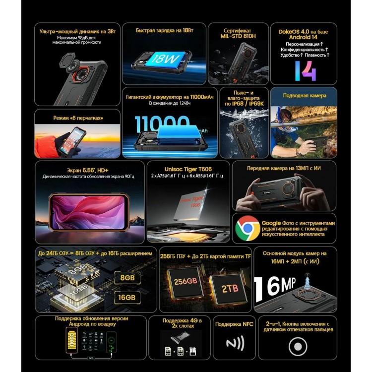 Процессор Unisoc Tiger T606 (8 ядер, 1,6 ГГц) и видеопроцессор Mali-G57 MP1 обеспечивают быструю работу устройства и плавность интерфейса. 128 ГБ встроенной памяти и 8 ГБ оперативной памяти позволяют хранить множество файлов и приложений.