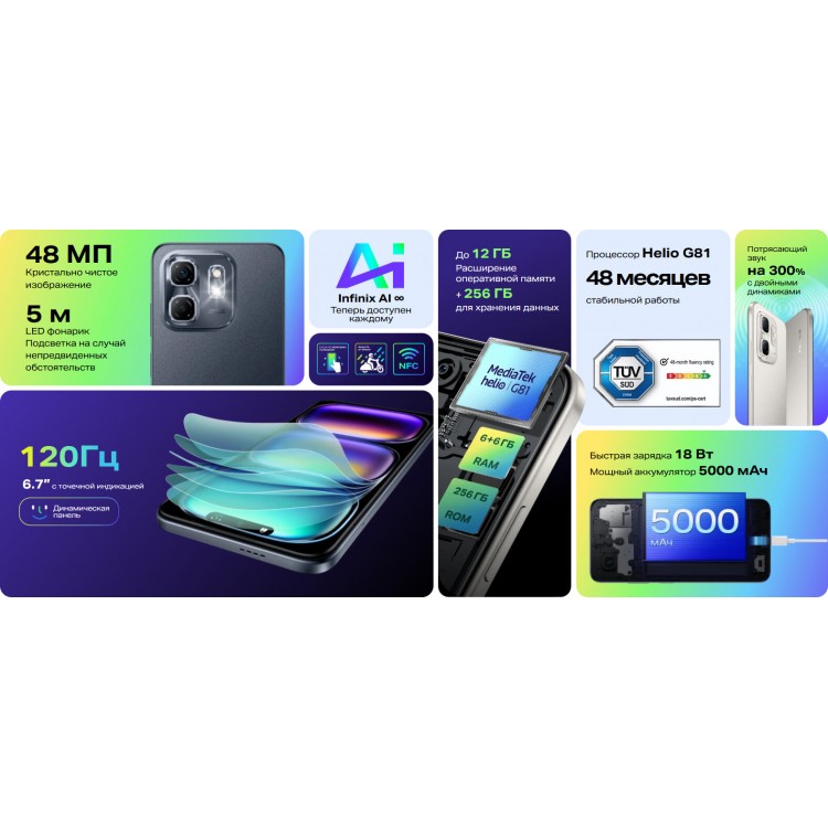 Название Смартфон Infinix HOT 50i; Бренд Infinix; Цвет товара фиолетовый; Версия Global для РФ; Версия ОС на начало продаж Android 14; Тип корпуса классический; Материал корпуса пластик; Степень защиты IP54, Нет; Количество SIM-карт Dual nano SIM; Вес 188 г; Размеры (ШxВxТ) 77.1x165.7x8.1 мм; Дисплей 6.7" (1600x720), HD, LCD; Особенности экрана Multitouch; Число пикселей на дюйм (PPI) 263; Частота обновления экрана 120 Гц; Функции камеры основная камера, фронтальная вспышка, фронтальная камера; Количество основных (тыловых) камер 2; Разрешение основной камеры 50 МП; Характеристики основной камеры 48MP; Характеристики основной камеры 2 Датчик освещенности; Макс. разрешение видео 2560x1440; Видеосъемка (основная камера) 1440x2560(2K) 1080x1920(1080P) 720x1280(720P); Разрешение фронтальной камеры 8 МП; Выход на наушники mini jack 3.5 mm; Стандарт связи 2G, 3G, 4G LTE, 5G, 2G/3G/4G (LTE), EDGE, GSM, HSPA+, LTE; Беспроводные интерфейсы Bluetooth, NFC, Wi-Fi, 3.5 мм, USB Type-C; Стандарт Wi-Fi 802.11ac; Стандарт Bluetooth 5.3; Геопозиционирование A-GPS, BeiDou, GPS, Galileo, ГЛОНАСС; Поддержка NFC есть; Процессор MediaTek Helio G81 Ultra; Характеристики процессора частота: 2000 МГц; количество ядер: 8; 2x2.0 ГГц Cortex-A75, 6x1.7 ГГц Cortex-A55; видеопроцессор: Mali-G52 MC2; Встроенная память 128 ГБ; Оперативная память 6 ГБ; Слот для карт памяти есть; Емкость аккумулятора 5000 мА⋅ч; Время в режиме воспроизведения видео 22 ч; Время работы в режиме ожидания 724 ч; Тип разъема для зарядки USB-C; Функции зарядки быстрая зарядка, Зарядка внешних устройств; Аккумулятор несъемный; Особенности FM-радио, акселерометр, гироскоп, датчик освещенности, датчик приближения, компас, стереодинамики, Безрамочный дисплей, Шагомер; Аутентификация разблокировка по лицу, Сканер отпечатка, разблокировка по отпечатку пальца; Заводская комплектация Адаптер для зарядки; Кабель; Инструкция; Гарантийный талон; Защитная пленка; Защитное стекло; Чехол; Булавка для сим-карты; Особенности товар сертифицирован; Дата анонсирования 2024; Дата старта продаж 2024; Габариты транспортной упаковки 10х20х10 см; Вес в транспортной упаковке 0.5 кг; Гарантийный срок 1 г; Бренд процессора MediaTek; Видеопроцессор Mali-G52 MP2; Восстановленный Нет; Время работы в режиме разговора, ч 26; Год анонсирования 2024; Макс. объем карты памяти, ГБ 2000; Поддержка eSim SIM (без eSIM); Размеры, мм 165.71x77.11x8x1; Тип карты памяти microSD; Форм-фактор SIM Nano-SIM; Число ядер процессора 8; Цвет мечтательный фиолетовый;