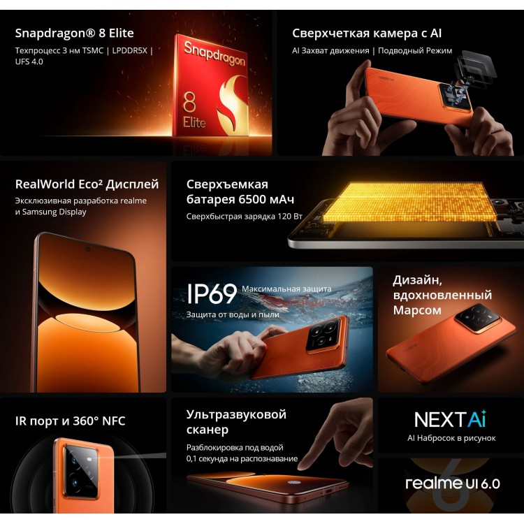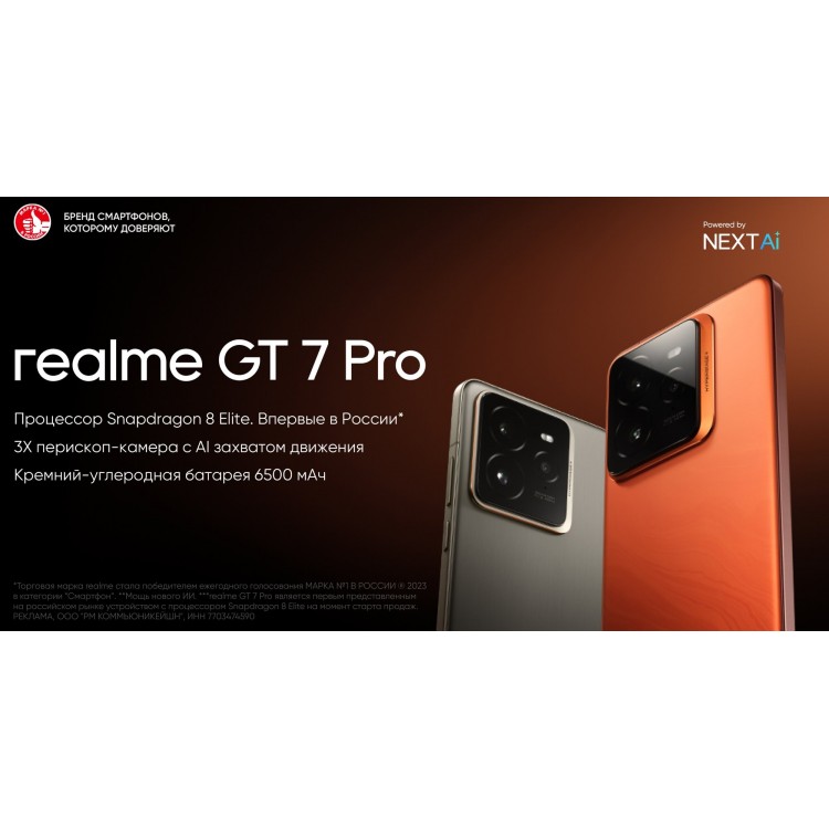 Название Смартфон realme GT 7 Pro; Бренд realme; Цвет товара марсианский оранжевый; Версия Global для РФ; Версия ОС на начало продаж Android 15; Тип корпуса классический; Материал корпуса алюминий и пластик; Степень защиты IP68, IP69, IP69K, no; Количество SIM-карт Dual nano SIM; Вес 223 г; Размеры (ШxВxТ) 76.89x162.45x8.55 мм; Дисплей 6.78" (2780×1264), Full HD, AMOLED; Особенности экрана сенсорный экран, устойчивое к царапинам стекло, цветной экран, Fullview дисплей, Изогнутый, Полноэкранный; Число пикселей на дюйм (PPI) 451; Частота обновления экрана 120 Гц; Функции камеры оптическая стабилизация, основная камера, тыловая вспышка, фронтальная камера, Автофокус, Режим ночного видения, Сверхширокоугольный объектив, Телеобъектив, Тройная камера, Широкоугольный объектив; Количество основных (тыловых) камер 3; Разрешение основной камеры 50 МП; Характеристики основной камеры 50M, Sony IMX906, f/1.8, 6P; Характеристики основной камеры 2 50M, Sony IMX882, f/2.65, 1G3P; Характеристики основной камеры 3 8M, Sony IMX355, f/2.2, 5P; Характеристики основной камеры 4 0.8µm, multi-directional PDAF, OIS, 3x optical zoom; Макс. разрешение видео 1920x1080; Видеосъемка (основная камера) 4K 60 fps, 1080P 60 fps, 720P 60 fps, 8k 24 fps; Разрешение фронтальной камеры 16 МП; Выход на наушники USB Type-C; Стандарт связи 2G, 3G, 4G LTE, 5G, 4G; Беспроводные интерфейсы Bluetooth, NFC, Wi-Fi, инфракрасный порт (IRDA), 3.5 мм, GPS, USB Type-C, Слот для SIM-карты; Стандарт Wi-Fi 802.11be; Стандарт Bluetooth 5.4; Геопозиционирование BeiDou, GPS, Galileo, NavIC, QZSS, ГЛОНАСС; Поддержка NFC есть; Процессор Qualcomm Snapdragon 8 Elite; Характеристики процессора частота: 4320 МГц; количество ядер: 8; 2x4.32 ГГц Oryon V2 Phoenix L, 6x3.53 ГГц Oryon V2 Phoenix M; видеопроцессор: Adreno 830; Встроенная память 512 ГБ; Оперативная память 12 ГБ; Слот для карт памяти нет; Емкость аккумулятора 6500 мА⋅ч; Время работы в режиме ожидания 540 ч; Тип разъема для зарядки USB-C; Функции зарядки быстрая зарядка; Тип быстрой зарядки Oppo SuperVOOC; Аккумулятор несъемный; Особенности акселерометр, барометр, гироскоп, датчик освещенности, датчик приближения, компас, GPS-трекер, Безрамочный дисплей, Датчик распознавания лица, Изогнутый экран, Камерофон, Оптическая стабилизация, Поддержка OTG (USB On-The-Go), Сканер отпечатка пальца, Смартфон с 5G, Смартфон с быстрой зарядкой, Спортивный смартфон, Стабилизация EIS, Шагомер; Аутентификация разблокировка по лицу, сканер отпечатка пальца, сканер отпечатка пальца на экране, Сканер отпечатка, Сканер отпечатка в экране; Заводская комплектация телефон, кабель USB Type-C, адаптер питания, защитный чехол, скрепка для извлечения лотка SIM карт, руководство по эксплуатации, буклет с важной информацией и гарантийный талон; Особенности Wi-Fi точка доступа; Датчик магнитного поля; Безрамочный дисплей; Оптическое увеличение 3x; Цифровое увеличение 120x; Дата старта продаж 2024-11-01; Габариты транспортной упаковки 9.80х18.40х6 см; Вес в транспортной упаковке 0.5 кг; Гарантийный срок 1 г; Бренд графического процессора Adreno; Бренд процессора Qualcomm; Видеопроцессор Adreno 830; Восстановленный false; Год анонсирования 2024; Макс. скорость видеосъемки, кадр/с 30; Поддержка eSim SIM (без eSIM); Размеры, мм 162.45×76.89×8.55; Форм-фактор SIM Nano-SIM; Число ядер процессора 8; Цвет оранжевый;