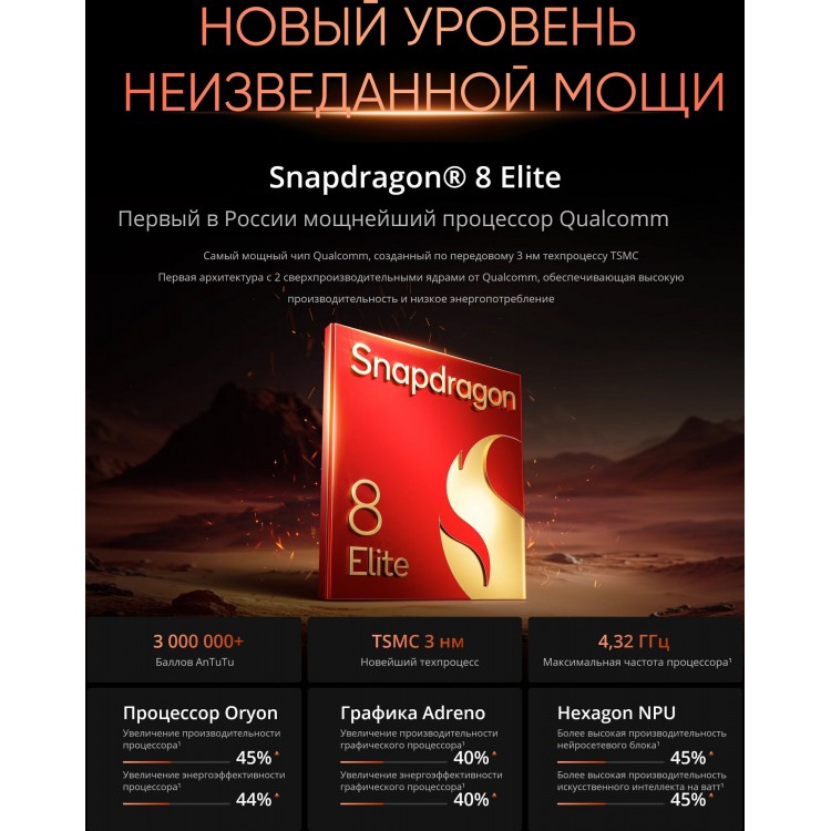 * Характеристики процессора: частота: 4320 МГц; количество ядер: 8; 2x4,32 ГГц Oryon V2 Phoenix L, 6x3,53 ГГц Oryon V2 Phoenix M; видеопроцессор: Adreno 830.