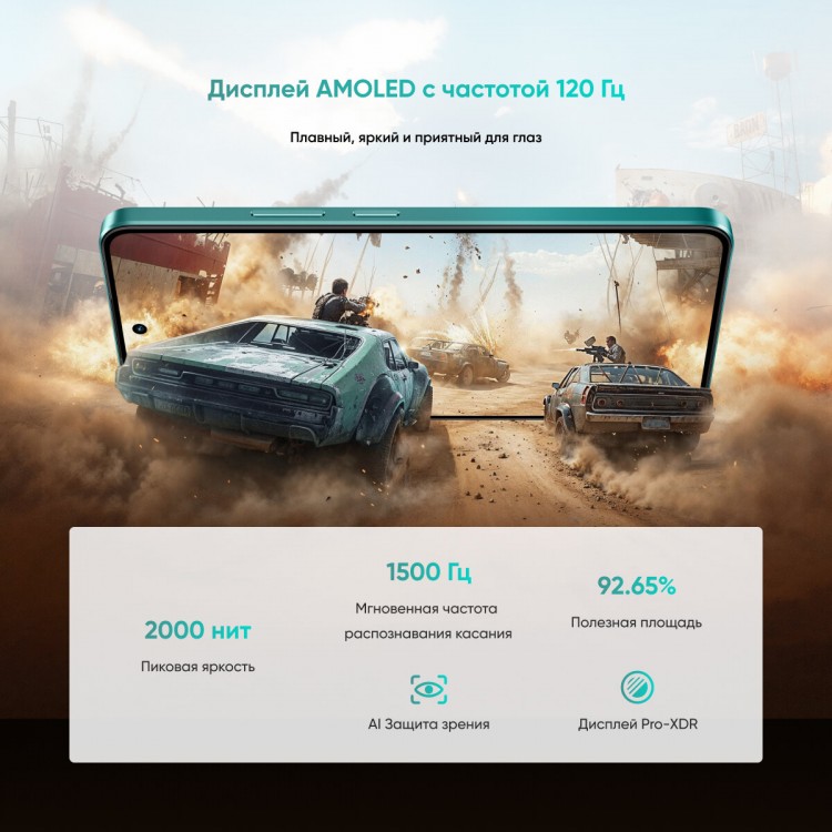 Диагональ экрана 6,67 дюймов и разрешение 2400x1080 позволяют наслаждаться яркими и чёткими изображениями. Формат разрешения Full HD и тип матрицы AMOLED создают качественное визуальное восприятие. Частота обновления экрана 120 Гц обеспечивает плавность отображения динамичных сцен.