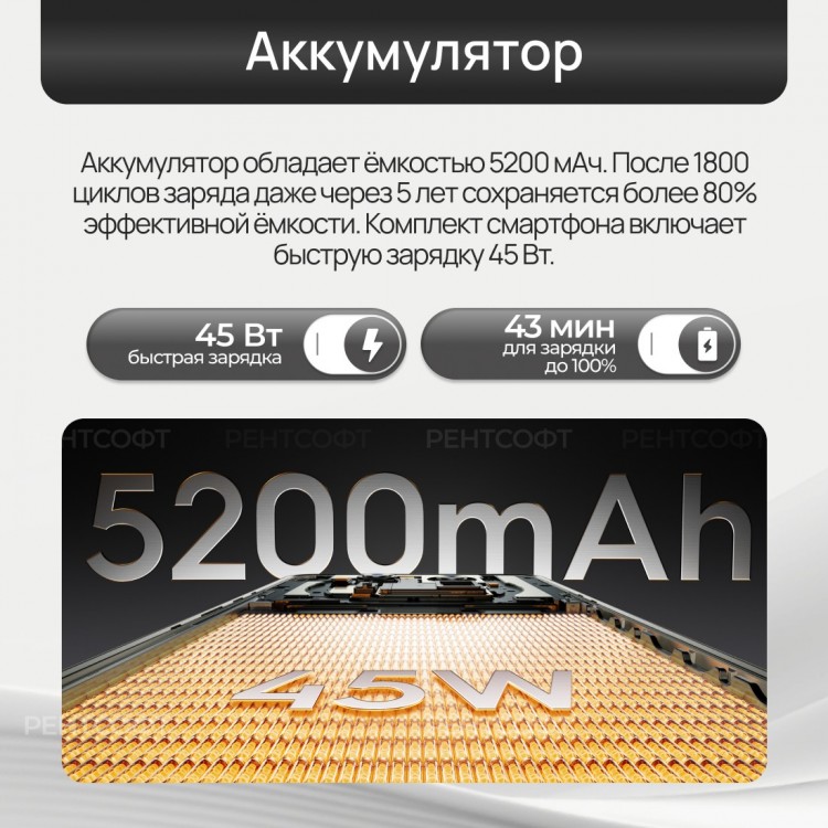 Процессор MediaTek Dimensity 7300 Ultimate обеспечивает быструю работу устройства. Встроенная память составляет 256 ГБ, а оперативная — 12 ГБ. Этого достаточно для хранения большого объёма данных и запуска требовательных приложений.