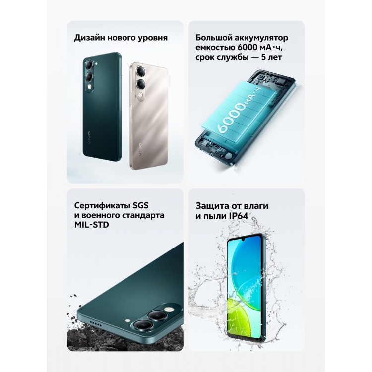 Название Смартфон vivo Y04s 4+256 ГБ, 6,74", 90 Гц, Титановое сияние.; Бренд Vivo; Обязательные программы предустановлены Да; Цвет товара Титановое сияние; Версия Ростест (EAC); Версия ОС на начало продаж Android 15; Операционная система Android; Тип корпуса Классический; Материал корпуса Пластик; Степень защиты IP64; Количество SIM-карт 2 nano SIM; Вес 199 г; Размеры (ШxВxТ) 167.3x167.3x8.19 мм; Диагональ экрана 6.74"; Разрешение экрана 1600x720; Тип матрицы экрана LCD; Число пикселей на дюйм 260; Частота обновления экрана 90 Гц; Разрешение дополнительного экрана 1600x720; Функции камеры Автофокусировка, основная камера, фронтальная камера; Количество основных камер 1; Разрешение основной камеры (точно) 13 Мпикс; Характеристики основной камеры Основная камера с разрешением 13 Мп: автофокусировка, f/2.2, угол обзора 81°, объектив 5P Сенсор глубины 0,08 Мп: f/3.0, угол обзора 40°, объектив 1P; Максимальное разрешение видеосъемки 1920x1080; Видеосъемка (основная камера) 1080; Разрешение фронтальной камеры 5 Мпикс; Разъем для наушников USB Type-C; Стандарт связи 2G, 3G, 4G LTE; Беспроводные интерфейсы Bluetooth, Wi-Fi; Версия Bluetooth 5.2; Навигационная система BeiDou, GPS, Galileo, QZSS, ГЛОНАСС; Процессор Unisoc T7225; Характеристики процессора T7225; Встроенная память 256 ГБ; Оперативная память 4 ГБ; Слот для карты памяти Да; Емкость аккумулятора (точно) 6000 мА·ч; Тип разъема для зарядки USB-C; Особенности Акселерометр, гироскоп, датчик освещенности, датчик приближения, фонарик; Аутентификация Разблокировка по лицу, сканер отпечатка пальца, сканер отпечатка пальца сбоку; Подробная комплектация В комплект входят: смартфон, блок зарядки, кабель Type-C, чехол, защитная плёнка (уже наклеена), документация и скрепка для SIM; Дата анонсирования 2025; Габариты транспортной упаковки 9.5x18x5.1; Вес в килограммах с учетом упаковки 0.39; Гарантийный срок 1 г; Цвет титановое сияние;