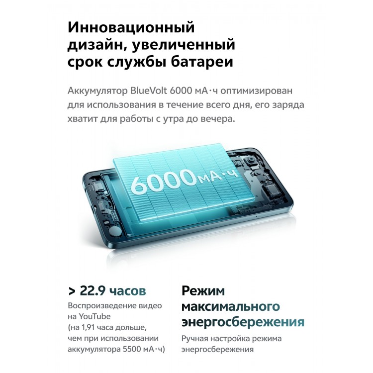 Благодаря процессору Unisoc T7225 смартфон работает быстро и без задержек. Встроенная память 256 ГБ и оперативная память 4 ГБ позволяют хранить много информации и запускать несколько приложений одновременно.