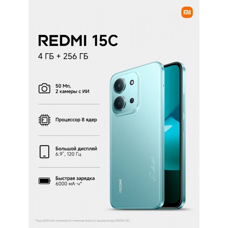 Название | Смартфон Redmi 15C RU 4/256 Гб, Dual nano SIM, NFC, Green, зеленый |