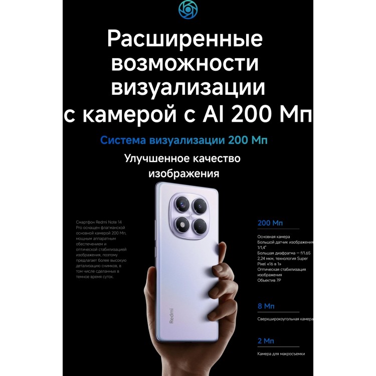 Название   Смартфон Xiaomi Redmi Note 14 Pro 4G; Бренд   Xiaomi; Версия ОС на начало продаж   Android 14; Операционная система   Android; Тип корпуса   классический; Материал корпуса   пластик; Степень защиты   IP54, IP64, IP68, защита от брызг; Вес   180 г; Размеры (ШxВxТ)   74.92x162.16x8.24 мм; Диагональ экрана   6.67"; Разрешение экрана   2400x1080; Формат разрешения экрана   Full HD; Тип матрицы экрана   AMOLED; Особенности экрана   вырез на экране, гибкий экран, изогнутый экран/waterfall, сенсорный экран, устойчивое к царапинам стекло, цветной экран; Число пикселей на дюйм   395; Частота обновления экрана   120 Гц; Диагональ дополнительного экрана   6.67"; Разрешение дополнительного экрана   1440x720; Функции камеры   автофокусировка, без вспышки, выдвижная камера, оптическая стабилизация, основная камера, тепловизор, тыловая вспышка, фронтальная вспышка, фронтальная камера; Количество основных камер   3; Разрешение основной камеры (точно)   200 Мпикс; Характеристики основной камеры   широкоугольная, 200 Мп, f/1.65, 2,24 мкм, OIS, PDAF; Характеристики основной камеры 2   сверхширокоугольная, 8 МП, f/2.2, 118˚, FF; Характеристики основной камеры 3   макро, 2 МП, f/2.4, AF; Характеристики основной камеры 4   Фронтальная камера: 20 миллионов пикселей; Характеристики основной камеры 5   Фазовая автофокусировка; Максимальное разрешение видеосъемки   1920x1080; Видеосъемка (основная камера)   1080p 60 кадр/сек; Разрешение фронтальной камеры   32 Мпикс; Разъем для наушников   mini jack 3.5 mm; Стандарт связи   2G, 3G, 4G LTE, 5G; Стандарт Wi-Fi 802.11   802.11ac; Версия Bluetooth   5.3; Навигационная система   A-GPS, BeiDou, GPS, Galileo, NavIC, QZSS, ГЛОНАСС; Слот для карты памяти   да; Емкость аккумулятора (точно)   5500 мА·ч; Время в режиме воспроизведения видео   14 ч; Время работы в режиме ожидания   126 ч; Время заряда   30 минут; Тип разъема для зарядки   USB-C; Функции зарядки   беспроводная зарядка, быстрая зарядка, реверсивная зарядка; Стандарт быстрой зарядки   Xiaomi HyperCharge; Крепление аккумулятора   несъемный; Особенности   FM-радио, LiDAR, акселерометр, барометр, встроенная рация, гироскоп, датчик SAR, датчик Холла, датчик освещенности, датчик приближения, для детей, для пожилых, игровой, клавиша управления камерой, компас, отдельный аудио ЦАП, стереодинамики, ударопрочный корпус, фонарик; Аутентификация   разблокировка по лицу, сканер отпечатка пальца, сканер отпечатка пальца на задней панели, сканер отпечатка пальца на передней панели, сканер отпечатка пальца на экране, сканер отпечатка пальца сбоку; Подробная комплектация   смартфон Redmi Note 14 Pro, адаптер питания, кабель USB Type-C, инструмент для извлечения SIM-карты, чехол, документация; Дополнительная информация   Видеосъемка: Задняя камера поддерживает видеосъемку в формате 4K (24/30 кадров в секунду), 1080p (30/60 кадров в секунду) и т.д.; Фронтальная камера поддерживает видеосъемку в формате 1080p (30/60 кадров в секунду), 720p (30 кадров в секунду) и т.д; Дата старта продаж   2024; Цвет   фиолетовое сияние;