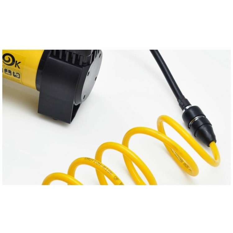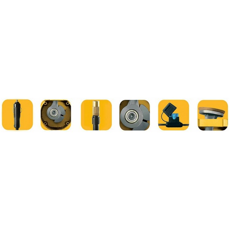 Красивый яркий жёлтый цвет самого компрессора и шланга, качественная сборка, приятно держать в руках, достойная комплектация: запасной предохранитель, переходник с прикуривателя на крокодилы чтобы подключаться напрямую к аккумулятору, переходнички для мяча и т.д! Качественная сумка для переноски и хранения!
