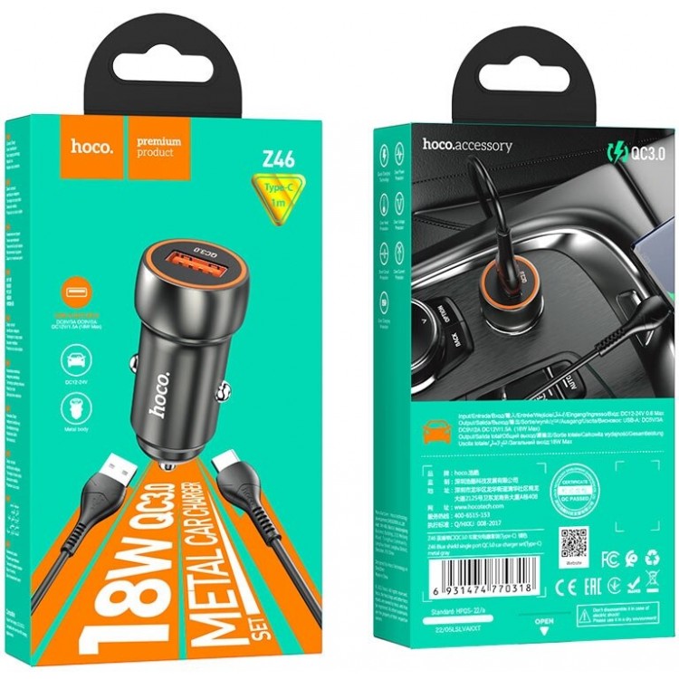 | Название | Автомобильное зарядное устройство HOCO Z46 Blue shield, 1xUSB с Кабелем USB - Type-C, 18W, серый металлик |