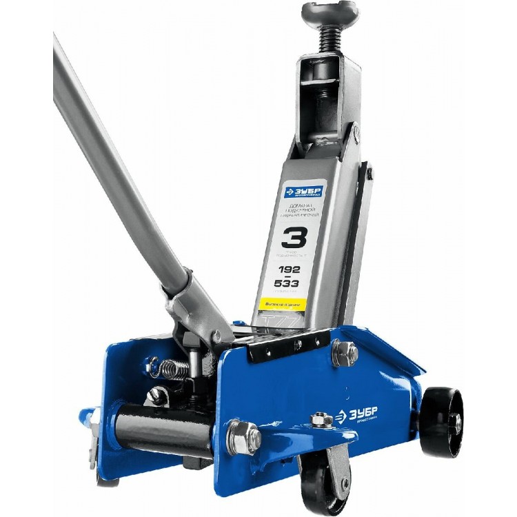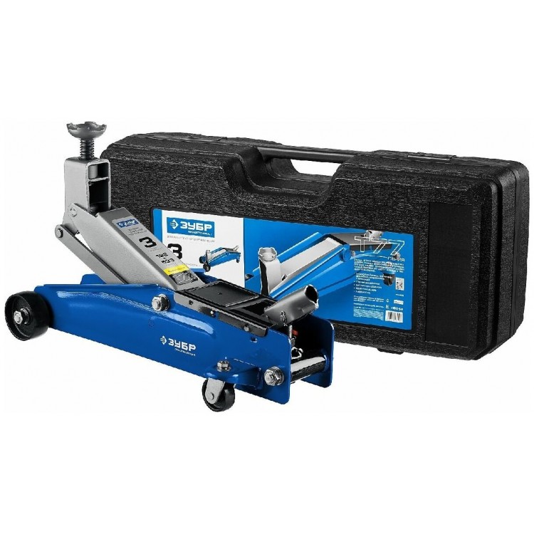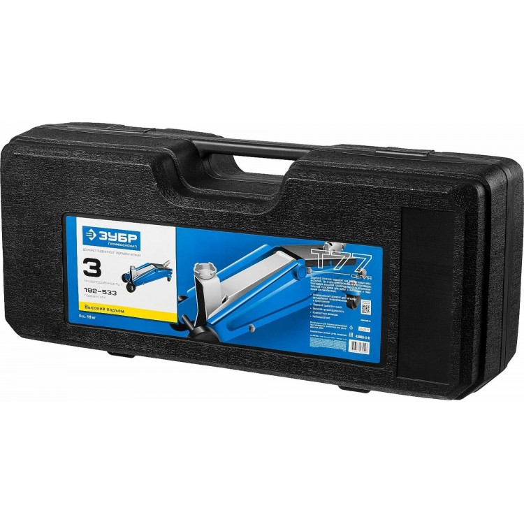 НазваниеПодкатной домкрат ЗУБР Профессионал 3т 192-533мм в пластиковом кейсе с резиновой накладкой