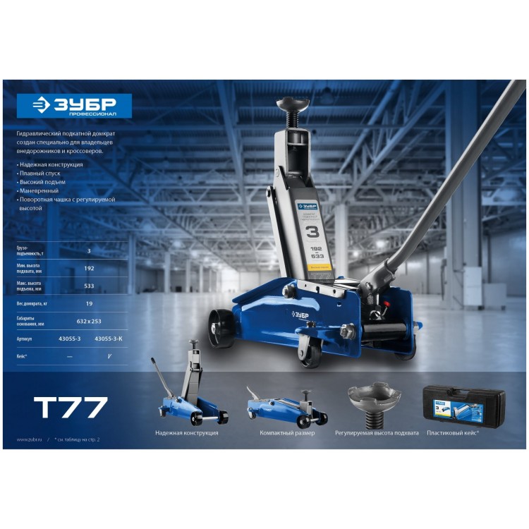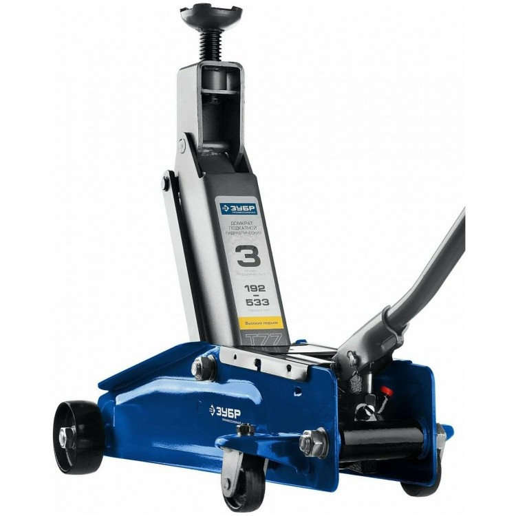 Подробная комплектацияПодкатной домкрат с высоким подъемом в кейсе ЗУБР Профессионал Т-77 3т 192-533мм (43055-3-K)