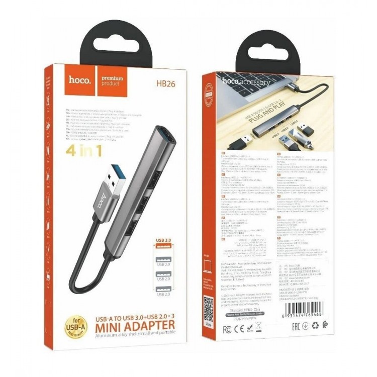 | Название | Хаб разветвитель USB 3.0 to USB 3.0 + 3*USB 2.0 Hoco HB26, темно-серый |