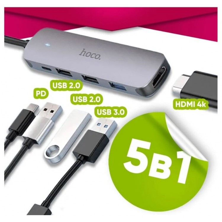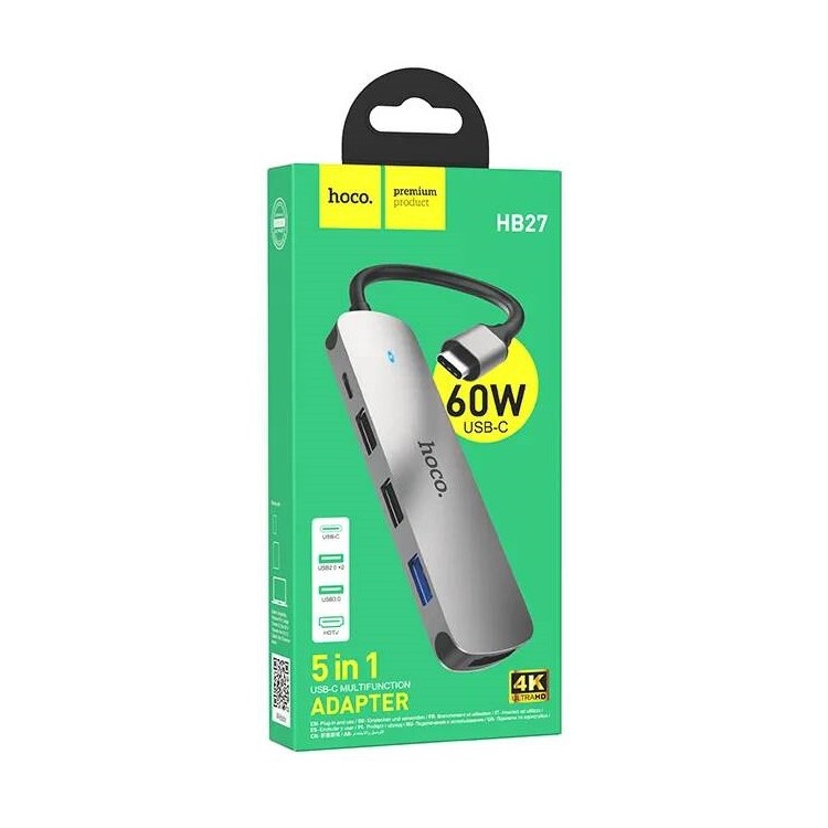 Интерфейс USB-C; Основной цвет серый; Бренд HOCO; Модель HB27; PartNumber/Артикул Производителя HB27; Питание через USB; Количество портов HDMI 1; Вес товара 43; Ширина товара 28.8; Глубина товара 109; Высота товара 11.6; Особенности Интерфейс: Type-C штекер на HDMI + PD + USB3.0 + 2*USB2.0.Поддержка разрешения 4K 30Hz. Type-C PD поддерживает зарядку до 60W (20V/3A) и передачу данных.; Количество портов USB 4; Длина упаковки (ед) 0.09; Ширина упаковки (ед) 0.025; Высота упаковки (ед) 0.181; Габариты упаковки (ед) ДхШхВ 0.09x0.025x0.181; Вес упаковки (ед) 0.1; Объем упаковки (ед) 0.00040725; Цвет серый;