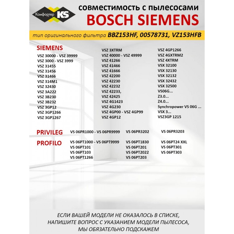 | Совместимые модели | Bosch: BSG6.., BSGL3., BSGL4.; Siemens: VS06G.,VSZ3.(Z3.0.), VSZ4. |