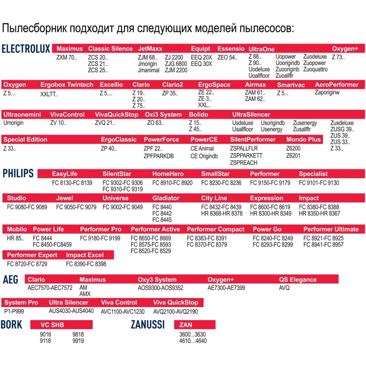 Совместимые модели | electrolux: silentperformer zspallfl, zspparkett, zspreachr; aeroperformer: zaporiginw; ergoclassic: zp 40..; powerforce: zpf 22., zpfparkdb; powerce: ce animal, ce origindb; equipt: eeq 20x, eeq 30x; maximus: zxm70.; classic silence: zcs2.; jetmaxx: jmorigin, jmanimal, zj 2200, zjg 6800, zjm 2200, zjm68.; essensio: zeo54.; ultraone: uodeluxe, uoallfloor, uopower, uoorigindb, zuooriginb, zuoallflr, zuodeluxe, zuopower, zuoquattro, z88., z90; ultrasilencer: usdeluxe, usallfloor, usorigindb, usenergy, zusenergy, zusallflr, zusdeluxe, zusg39., zus39., zus33., z33.; special edition: z 33., ultrasilencer; ergobox twintech: xxltt.; mondo plus z620.;clario: z19., z20., z75.; clario2: zp35.; ergospace: ze22., ze3., xxl.; airmax: zam61., zam62.; excellio: z5.; smartvac: z5.; vivacontrol: zv10.; vivaquickstop: zvq21.; oxygen+: z73.; oxygen: z5…; oxi3 system: zo63.; bolido: z15., z45.; ultraonemini: umorigin; philips: performer ultimate fc8924-8925; performer compact fc8383-8391; performer pro fc9180-9199; performer active fc8585-8589, fc8650-8661; powerlife fc8450-8459; easylife fc8130-8139; silentstar fc9302-9306, fc9310-9319; homehero fc8910-8920; smallstar fc8230-8236; studio fc9080-9089; gladiator fc8440-8445; expression fc8600-8619, hr8300-8349; impact fc8380-8388, hr8350-8367; impact excel fc 8390-8398;city line fc 8432-8439, hr 8368-8378; performer fc9150-9179; jewel fc9050-9079; mobilo hr 85.; universe fc9002-9049; specialist fc9101-9130; aeg: clario aec7570-7572; maximus am, amx; oxy3 system aos9300-9352; oxygen+ ae7300-7399; qs elegance avq; system pro p1-p999; ultra silencer aus4030-4040; viva control avc1100-1230; viva quickstop avq2100-avq2190; bork: vc shb 9016, 9118, 9818, 9919; zanussi: zan 3600.3630; zan 4610.4640 |