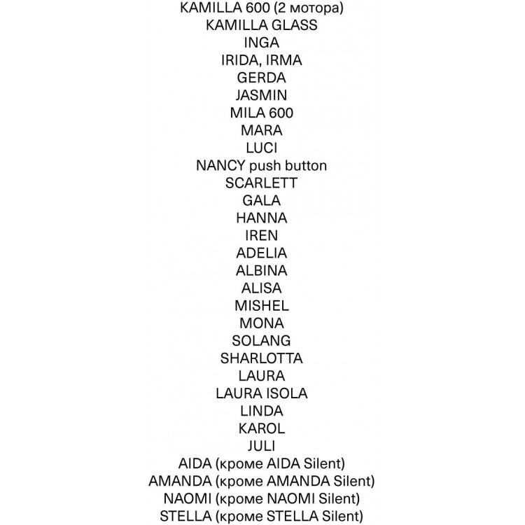 | Совместимость | Kamilla (2 мотора),Kamilla power, Irma, Inga Levana, Adelia CPB, Amanda (кроме Amanda Silent) Alisa, Aida (кроме Aida Silent) Stella Gretta CPB 900, Jasmin, Karol, Luci Naomi (кроме Naomi Silent), Sharlotta |