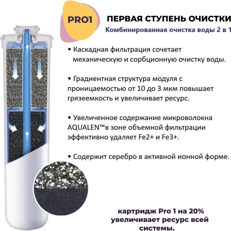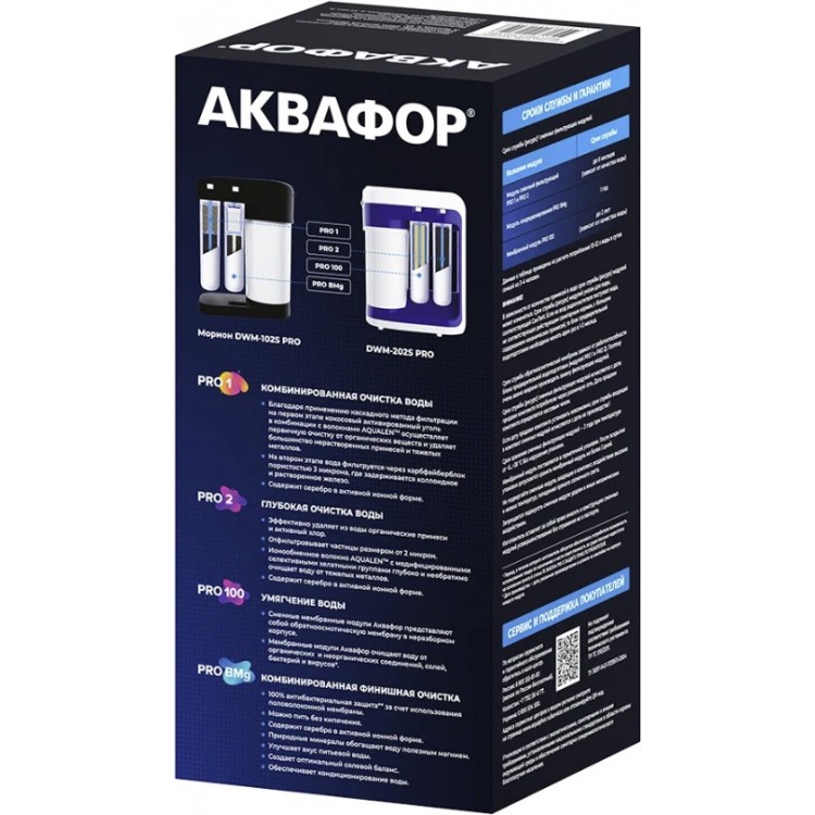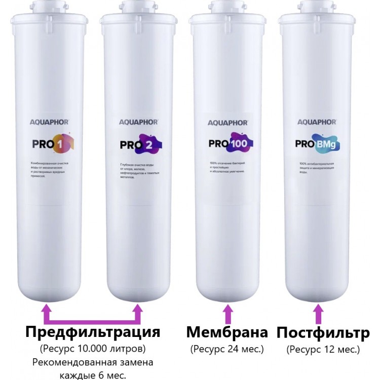 | Срок службы | 2 г., Ресурс предфильтров Pro1 и Pro2 (10.000 литров). В зависимости от качества водопроводной воды рекомендуемая производителем замена каждые 6 мес. Ресурс мембраны Pro100 - 24 мес. Ресурс постфильтра-минерализатора Pro BMg - 12 мес |