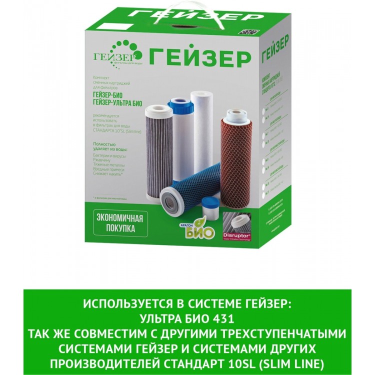 Дополнительная информация | используется в стационарных трехступенчатых фильтрах Гейзер Ультра БИО 431 (для очищения сверхжесткой воды); комплектация: Арагон 2 БИО, БС, Дисраптор/Fiber PRO/MMB, муфта уплотнительная тип "И" |
