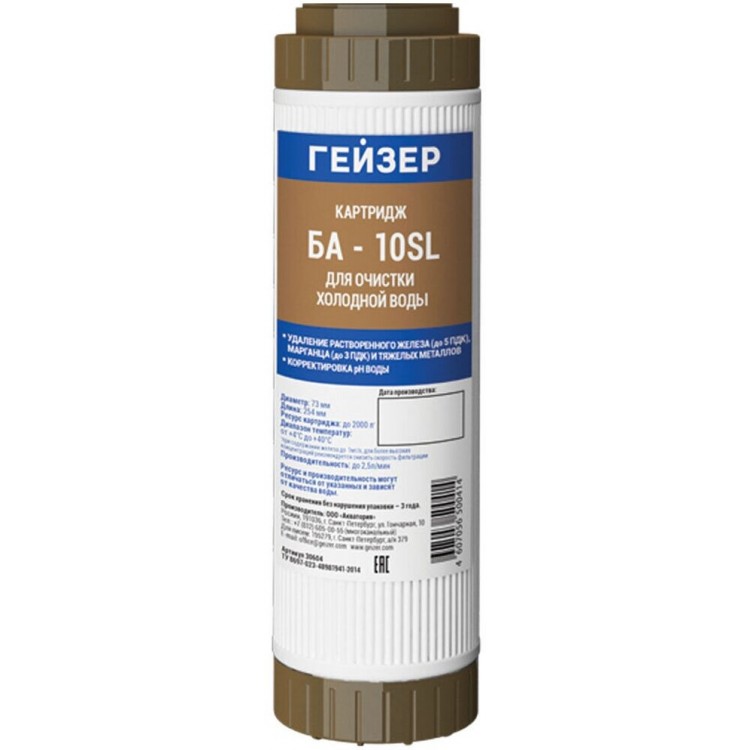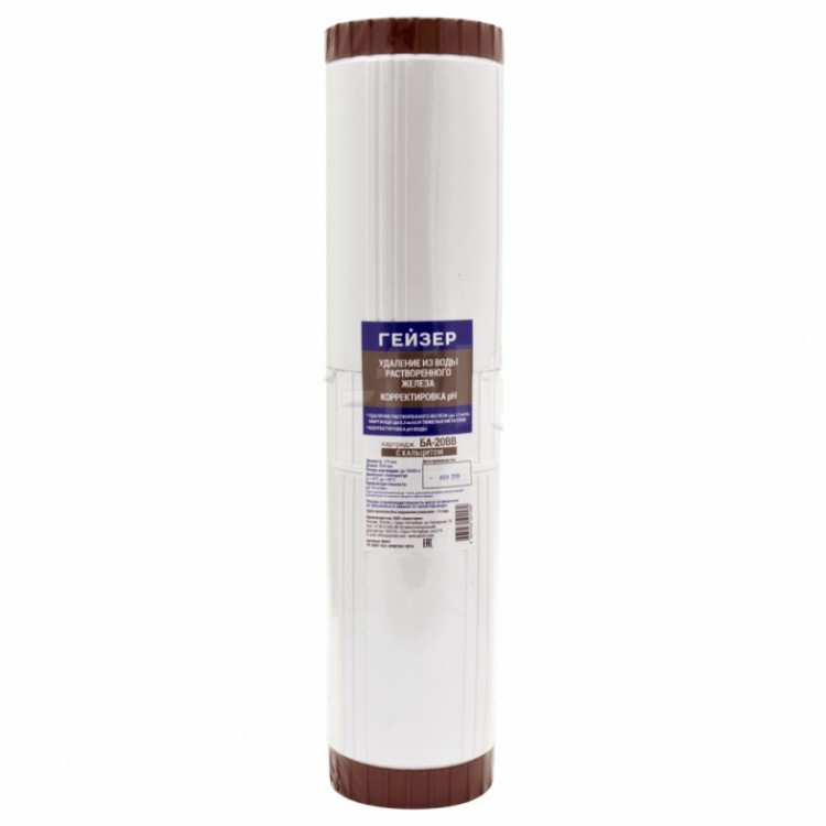 Картридж Гейзер БА 20BB эффективно очищает воду от избыточного растворённого железа (до 1 мг/л), соединений других металлов, а также солей жёсткости. Картридж подходит для магистральных фильтров и устанавливается в систему холодного водоснабжения.
