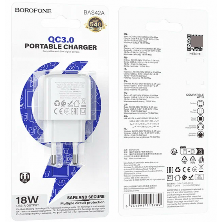 - Сетевое зарядное устройство Borofone BAS42A 18W QC3.0 charger(EU) (белый)