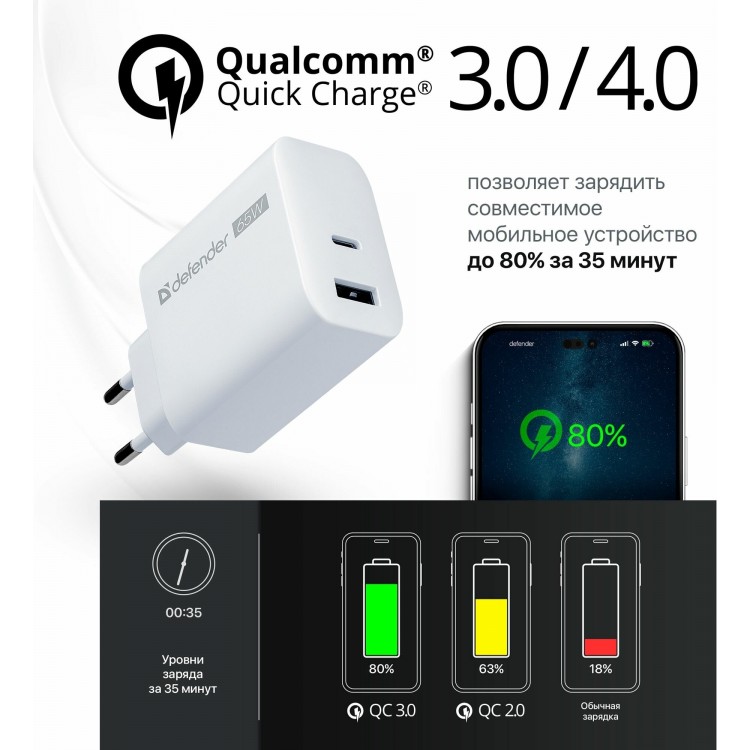 Сетевое зарядное устройство Defender UPA-165 USB A+C 65W (83582) (белый)