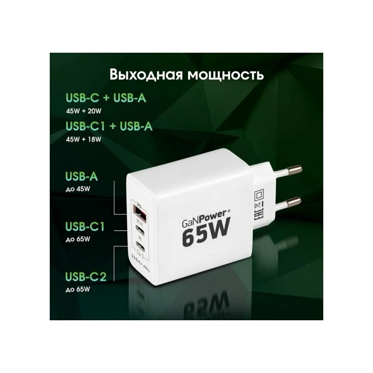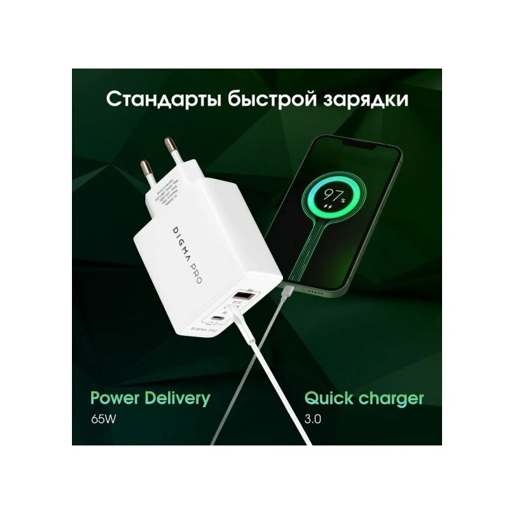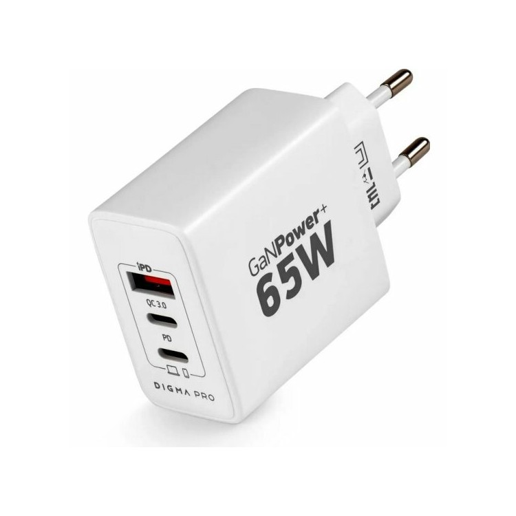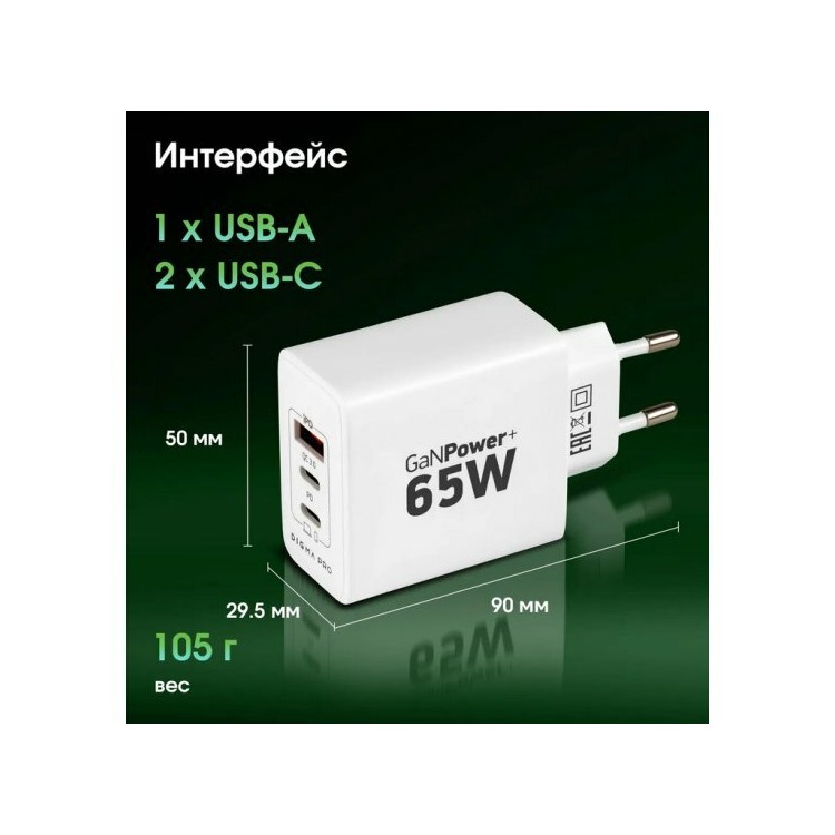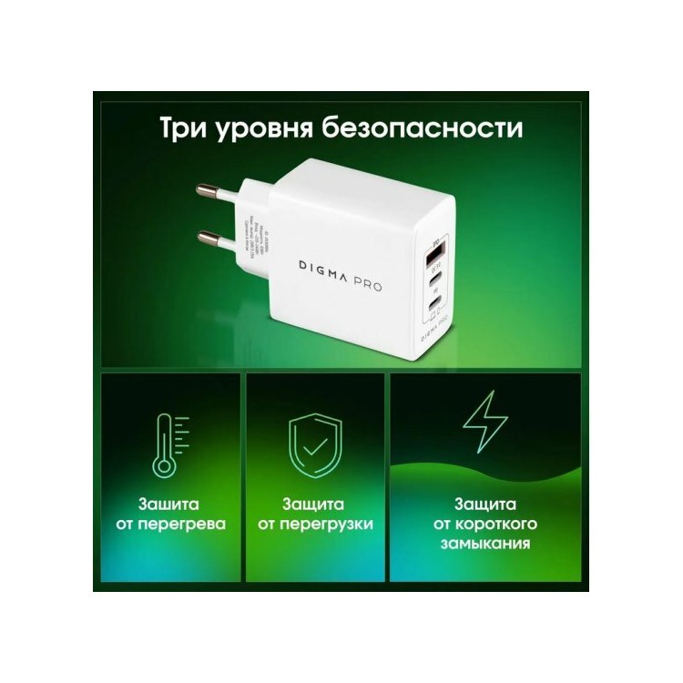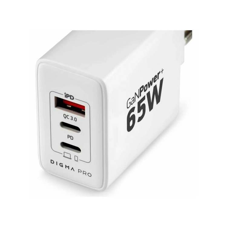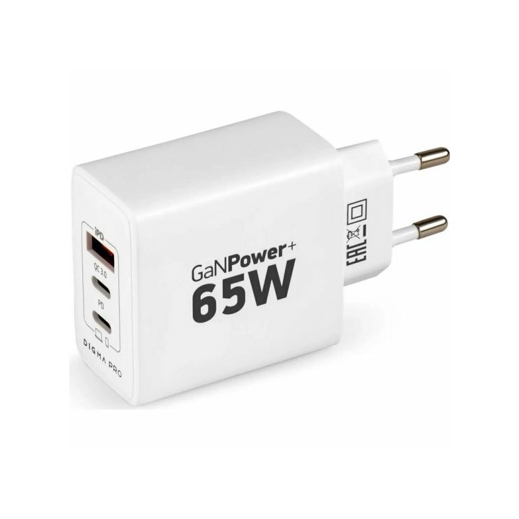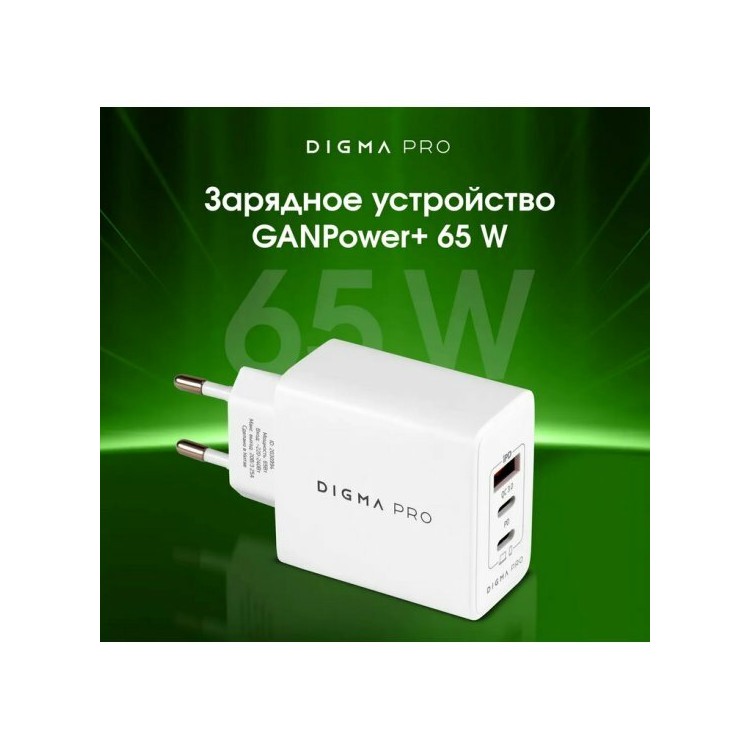 - Сетевое зарядное устройство DIGMA Pro DPW6B (PD+QC) 2хUSB-C/USB-A 65W 3.25A (DPW6B5GX12WH) (белый)