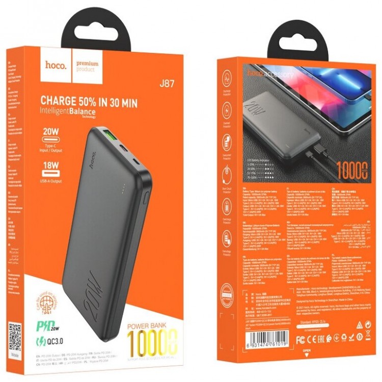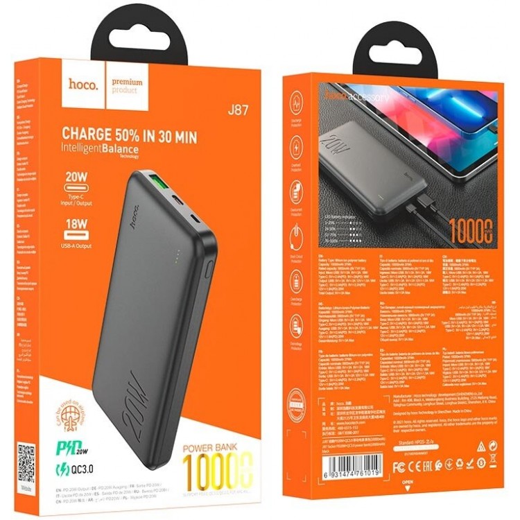 | Название | Портативный аккумулятор HOCO J87 Tacker PD20W+QC3.0, 3A, 10000 мА⋅ч, черный, светодиодный индикатор |