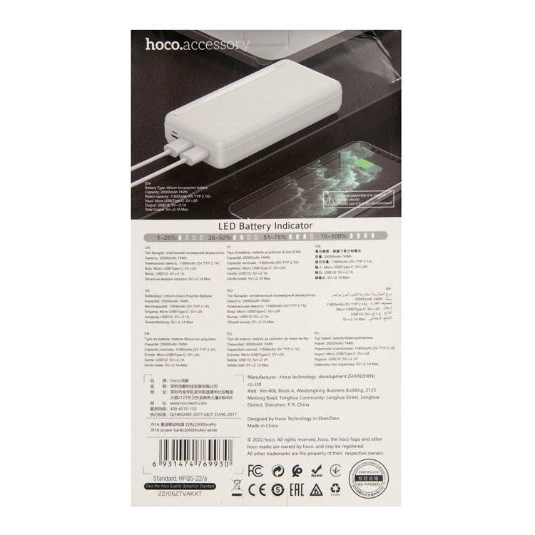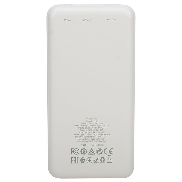 | Название | Портативный внешний аккумулятор HOCO J91A, 2.1A, 20000 мАч, белый |