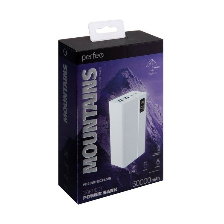 | Название | Perfeo Powerbank MOUNTAINS 50000 mAh/LED дисплей/PD + QC 3.0/Type-C/4 USB/Выход: 3A, max 22.5W/White (PF_B4888) |