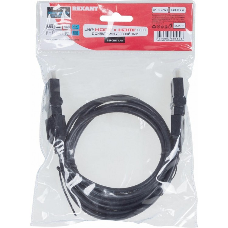 | Название | Rexant Кабели 17-6204-3 Кабель HDMI - HDMI 1.4, 2м, Gold, с фильтрами, угловой 360 |