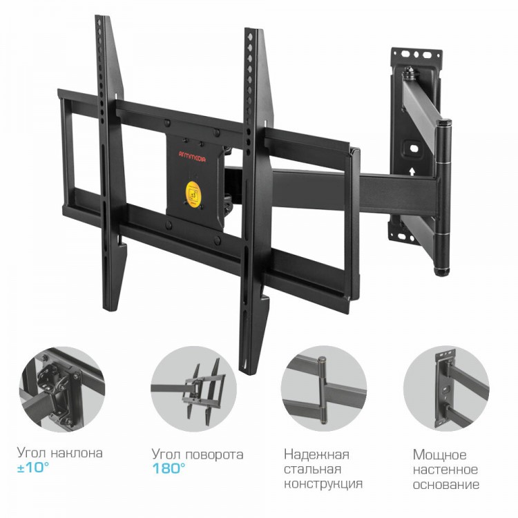 Название Кронштейн для телевизора настенный наклонно-поворотный Arm Media PARAMOUNT-75 / до 70 дюймов / vesa 600x400; Бренд Arm Media; Линейка PARAMOUNT; Тип Кронштейн для ТВ; Назначение ЖК-телевизор; Количество степеней свободы 5; Диагональ ТВ 32-70 "; Максимальная нагрузка 60 кг; Способ регулировки наклон, отступ от стены, поворот; Материал металл; Регулировка расстояние до стены/потолка есть; Расстояние от стены/потолка 87-737 мм; Угол наклона вверх 10 °; Угол наклона вниз 10 °; Угол поворота ответной части 150 °; Стандарт Vesa 200x200 мм, 200x300 мм, 200x400 мм, 300x200 мм, 300x300 мм, 400x200 мм, 400x300 мм, 400x400 мм, 600x400 мм; Вес 5.79 кг; Дополнительная информация Большой вынос от стены до 737 мм, 5 ст. свободы; Габариты транспортной упаковки 33х69х7.50 см; Вес в транспортной упаковке 6.34 кг; Гарантийный срок 18 лет; Комплектация Кронштейн для телевизора, комплект ключей и крепежа для установки ТВ, навесной уровень, подробная инструкция на русском языке; Место крепления На стену; Размеры, мм 288x720x73; Цвет черный;