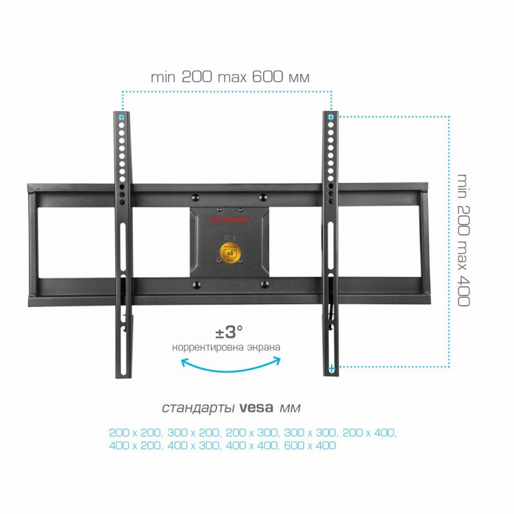 | Стандарт Vesa | 200x200 мм, 200x300 мм, 200x400 мм, 300x200 мм, 300x300 мм, 400x200 мм, 400x300 мм, 400x400 мм, 600x400 мм |