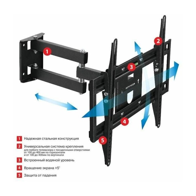 * Регулировка положения. Можно регулировать наклон, наклон и поворот телевизора, а также отступ от стены и поворот кронштейна.