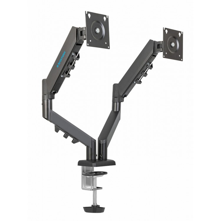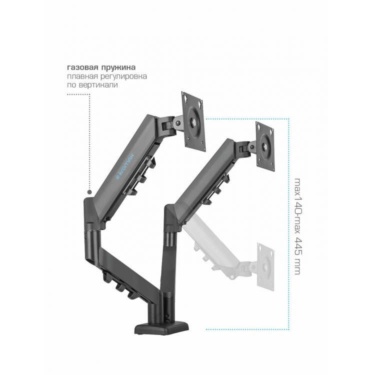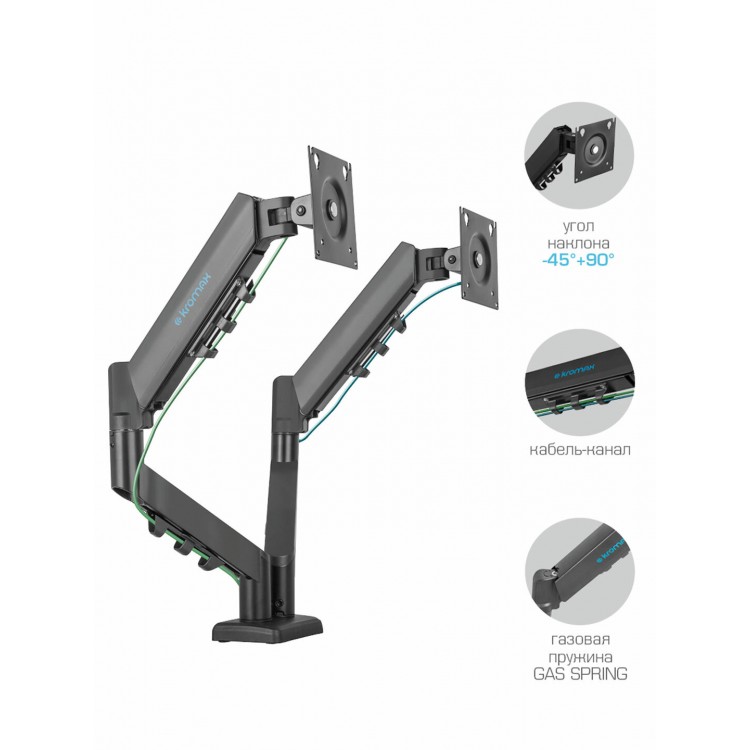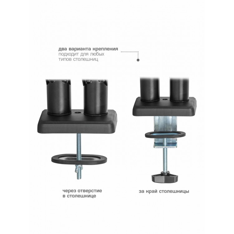 Держит мониторы 27" без проблем. Все колена имеют винты фиксации. в комплекте в,е что надо для двух вариантов установки(можно просверлить столешницу, можно зацепить за край столешницы). Вполне универсален в плане расположения мониторов.