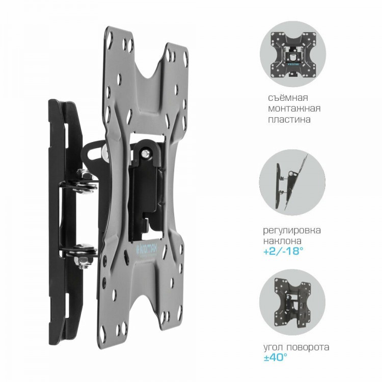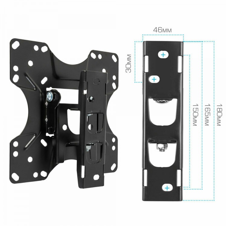 Этот кронштейн разработан специально для ЖК-телевизоров с диагональю от 19 до 43 дюймов. Он выдерживает максимальную нагрузку до 30 кг и имеет две степени свободы — наклон и поворот.