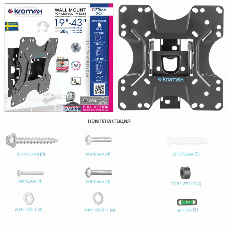 | Название | Кронштейн для телевизора настенный наклонно-поворотный Kromax OPTIMA-201 / до 43 дюймов / vesa 200*200 |