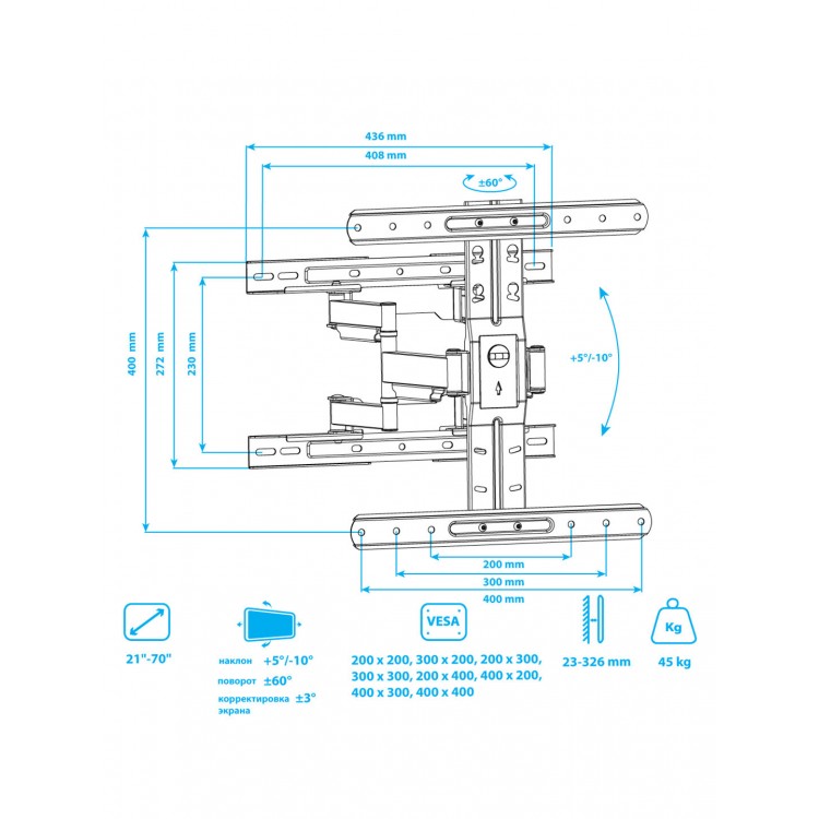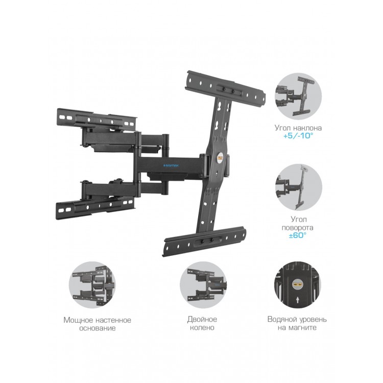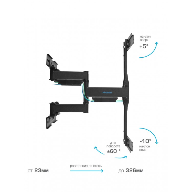 Благодаря регулировке наклона, поворота и возможности изменения расстояния до стены или потолка, вы сможете легко настроить оптимальное положение для вашего телевизора. Минимальное расстояние от стены — всего 23 мм, а максимальное — 326 мм.