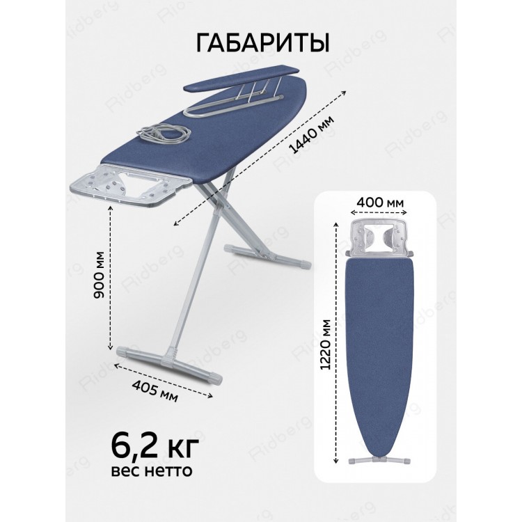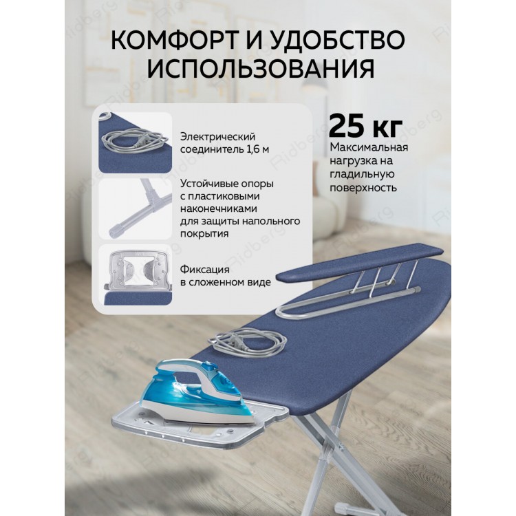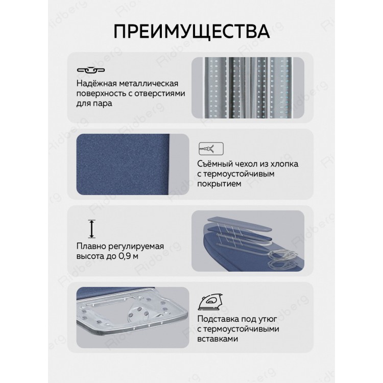 устойчивая доска, удобный размер, хорошо регулируется по высоте, качественный чехол, удачная подставка для утюга. Ничего лишнего!