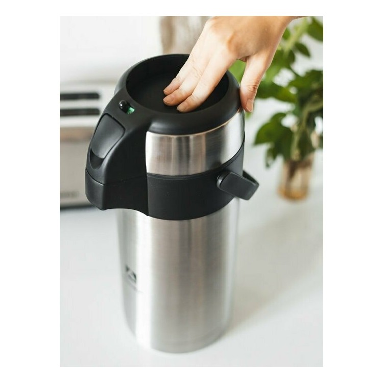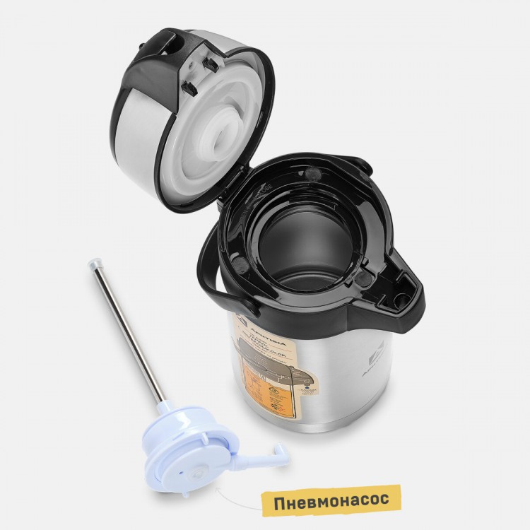 Объемный, большая горловина, температуру держит заявленное время (сутки вода горячая, а температуру выше комнатной сохраняет 2 суток), съемная помпа-крышка.