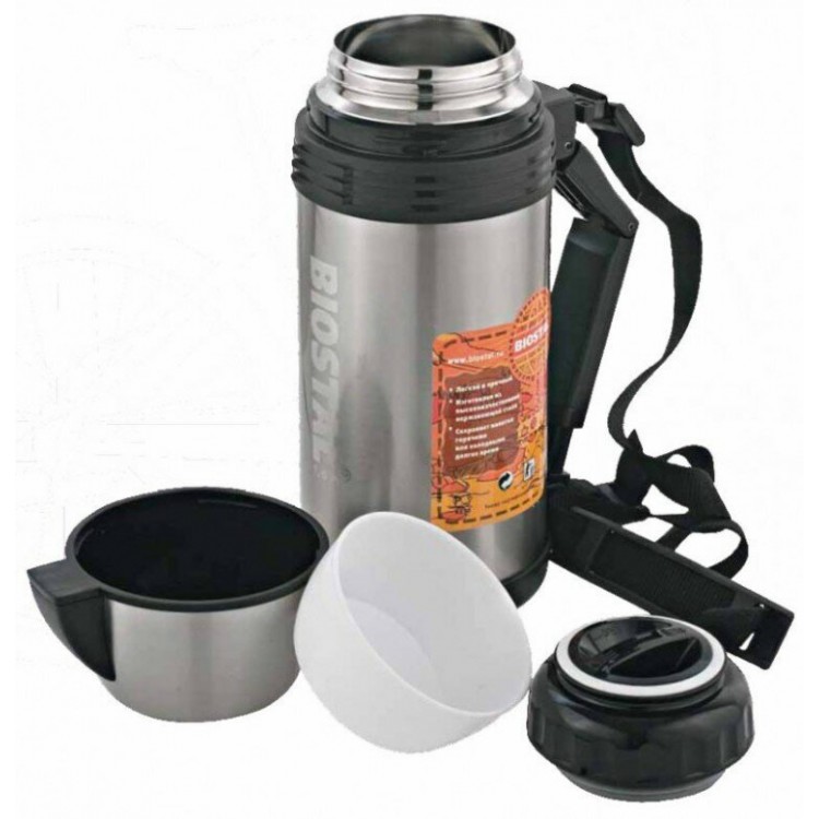 Термос хорошо держит тепло и холод, удобный, имеет дополнительную чашку из белой пластмассы, универсальная горловина хорошо подходит и для напитков, и для основных блюд, благодаря ей термос легко мыть, есть ремень, на котором термос можно носить на плече, на шее или просто где-то повесить.