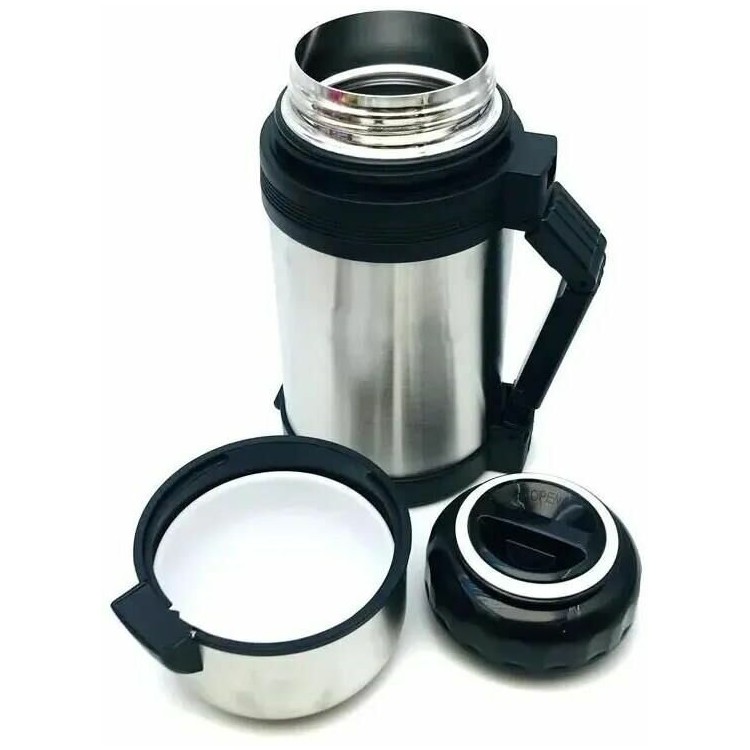Термос имеет широкую горловину, поэтому его удобно мыть. У него есть удобная ручка на корпусе и ручка для переноса, что делает его комфортным в использовании. Крышка-чашка позволяет использовать термос как обычную чашку.