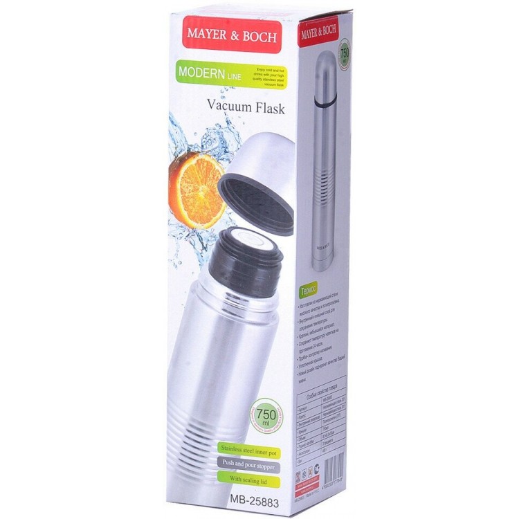 Термос MAYER&BOCH 25883 имеет объём 0,75 литра и узкую горловину, что делает его удобным для использования как дома, так и в дороге.