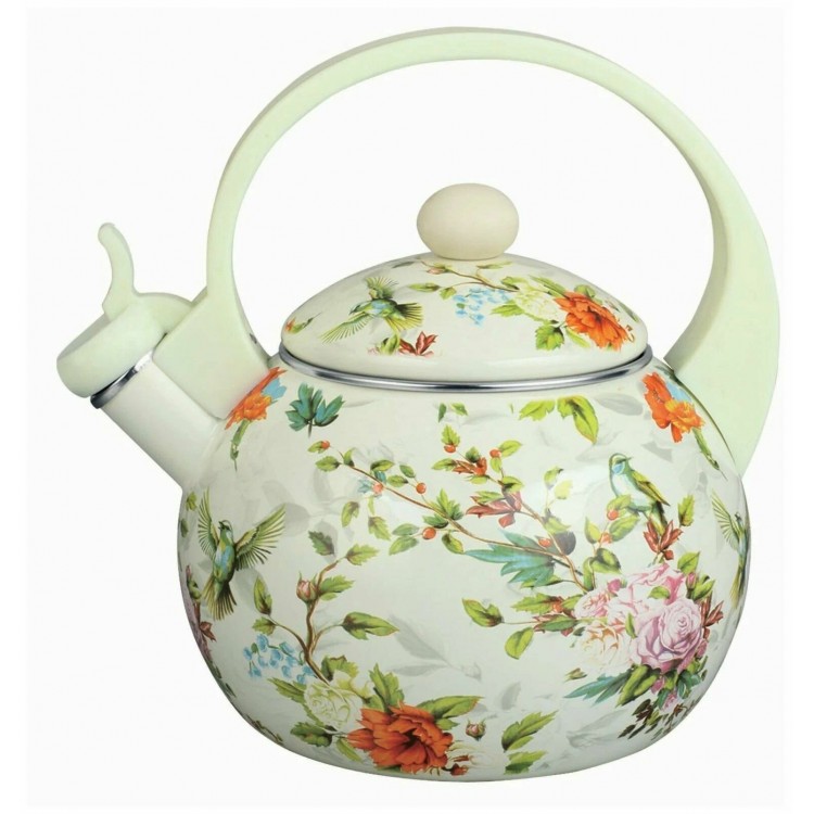чайник радует глаз, красивый,с цветочным принтом и летающими птицами, объем средний,свисток работает и слышно,когда чайник закипает.