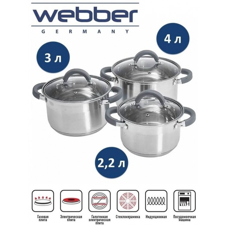 | Название | WEBBER BE-625/6 Набор посуды из нерж. стали 6 пр. 2,2л, 3,0л, 4,0л со стеклянными крышками |