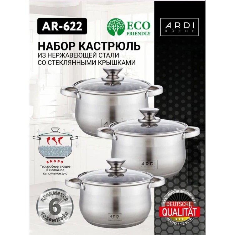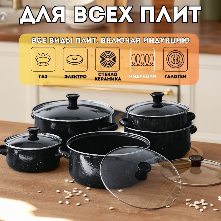 Набор мини-кастрюль, 6 предм. (3 КАСТРЮЛИ С КРЫШКАМИ: 0,5 Л (d12 см), 0.8 Л (d14 см), 1,2 Л (d16 см) с внутренним эмалированным покрытием), эмалированная сталь, внешнее покрытие - эмаль с рисунком. Подходит для индукции.
