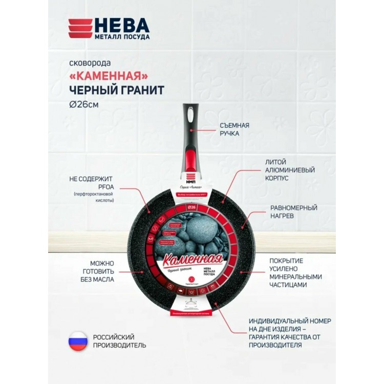Сковорода НЕВА МЕТАЛЛ ПОСУДА " Каменная" 18026 съемная ручка 26 см (черный гранит)
