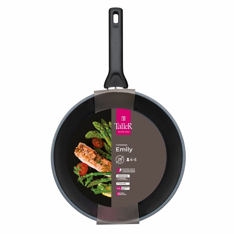 Наслаждайтесь готовкой с глубокой сковородой Taller Эмили, которая имеет диаметр 28 см и удобную ручку из бакелита с покрытием soft-touch.