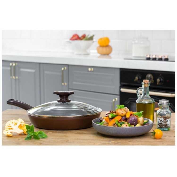 - Современный дизайн. Коричневый цвет и стильный дизайн сковороды станут украшением вашей кухни.