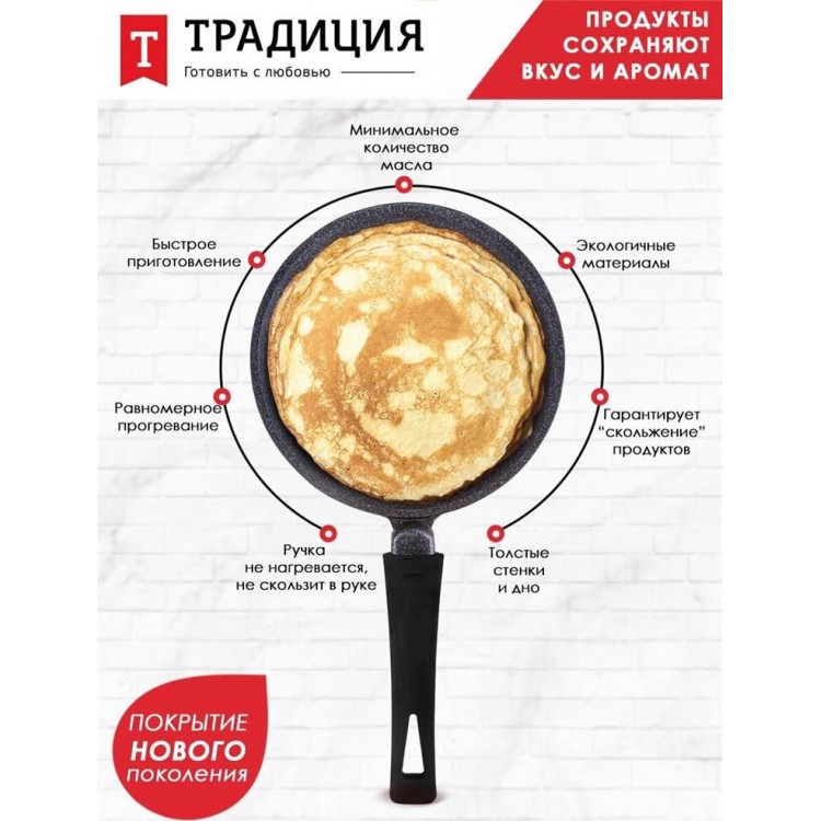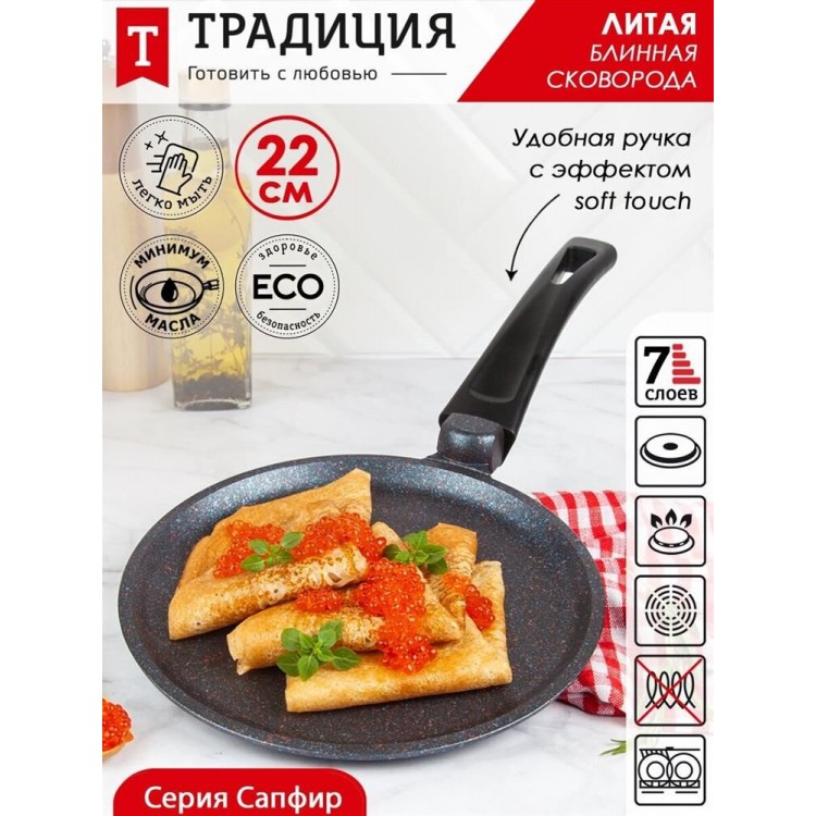 Отличная сковорода, маме очень понравилась, удобно жарить и переворачивать блины, не пригорают, удобна в руках по форме и весу, масла минимум, повышенный срок службы.