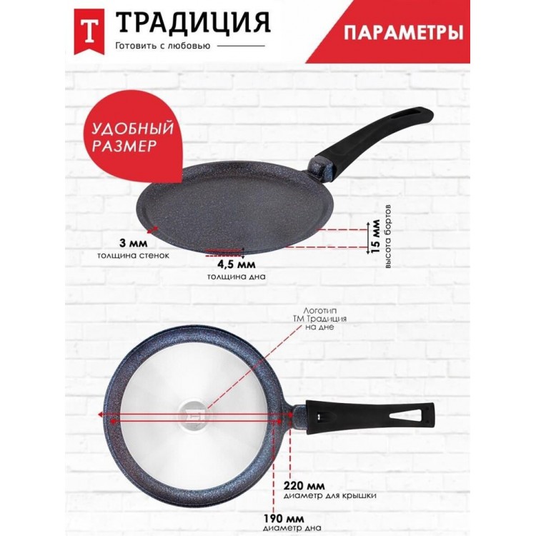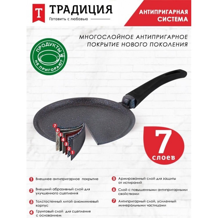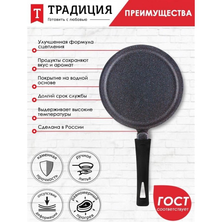 Очень понравилась данная сковорода, отличное антипригарное покрытие, ничего не пригорает, удобная ручка. Один из главных критериев так же производство Россия. В посудомойке лучше не мыть (хотя на этикетке написано что можно), так как дно похоже алюминиевое и темнеет от химии.